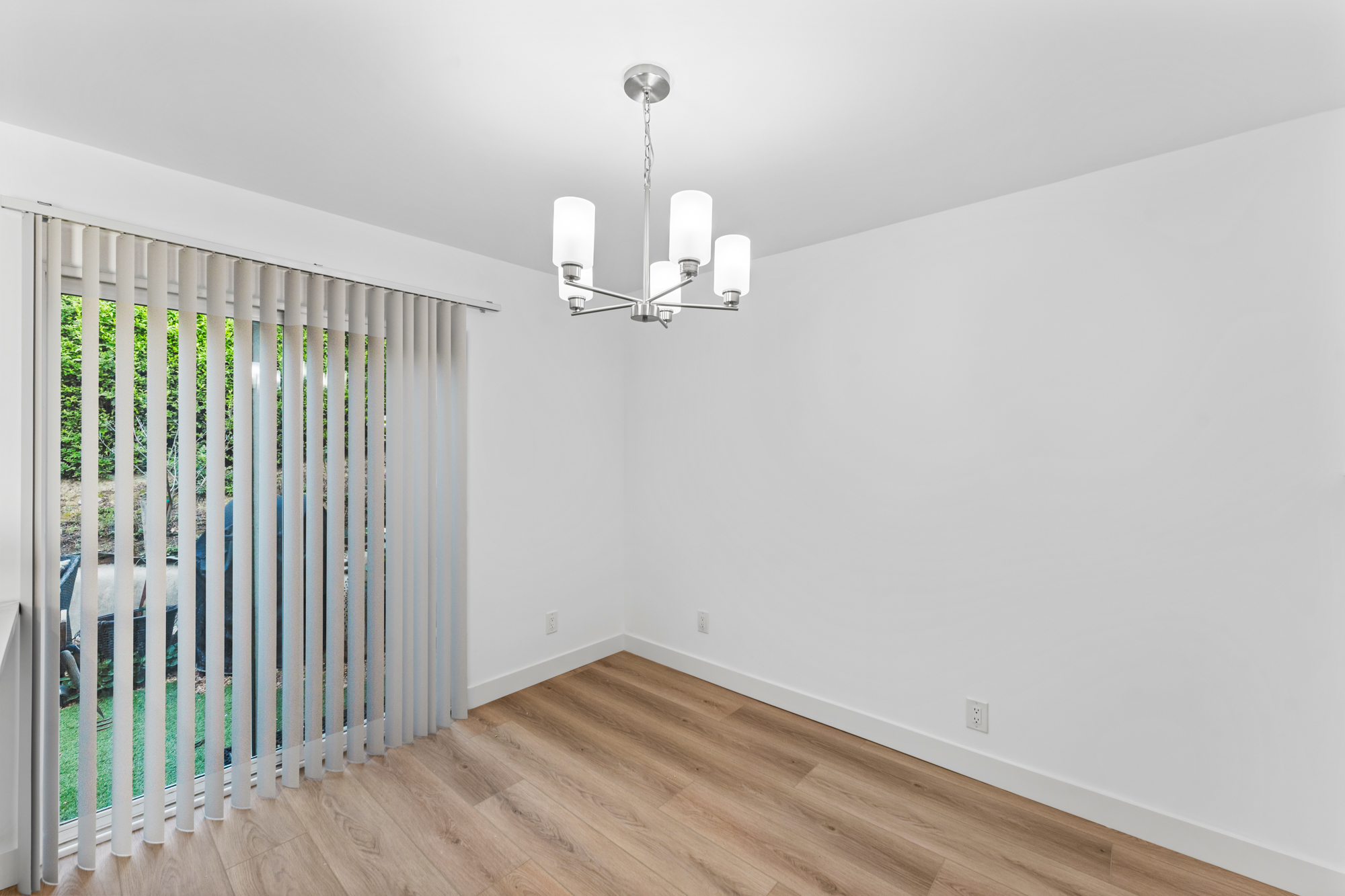 Bright white walls, luxury vinyl plank flooring, modern lighting