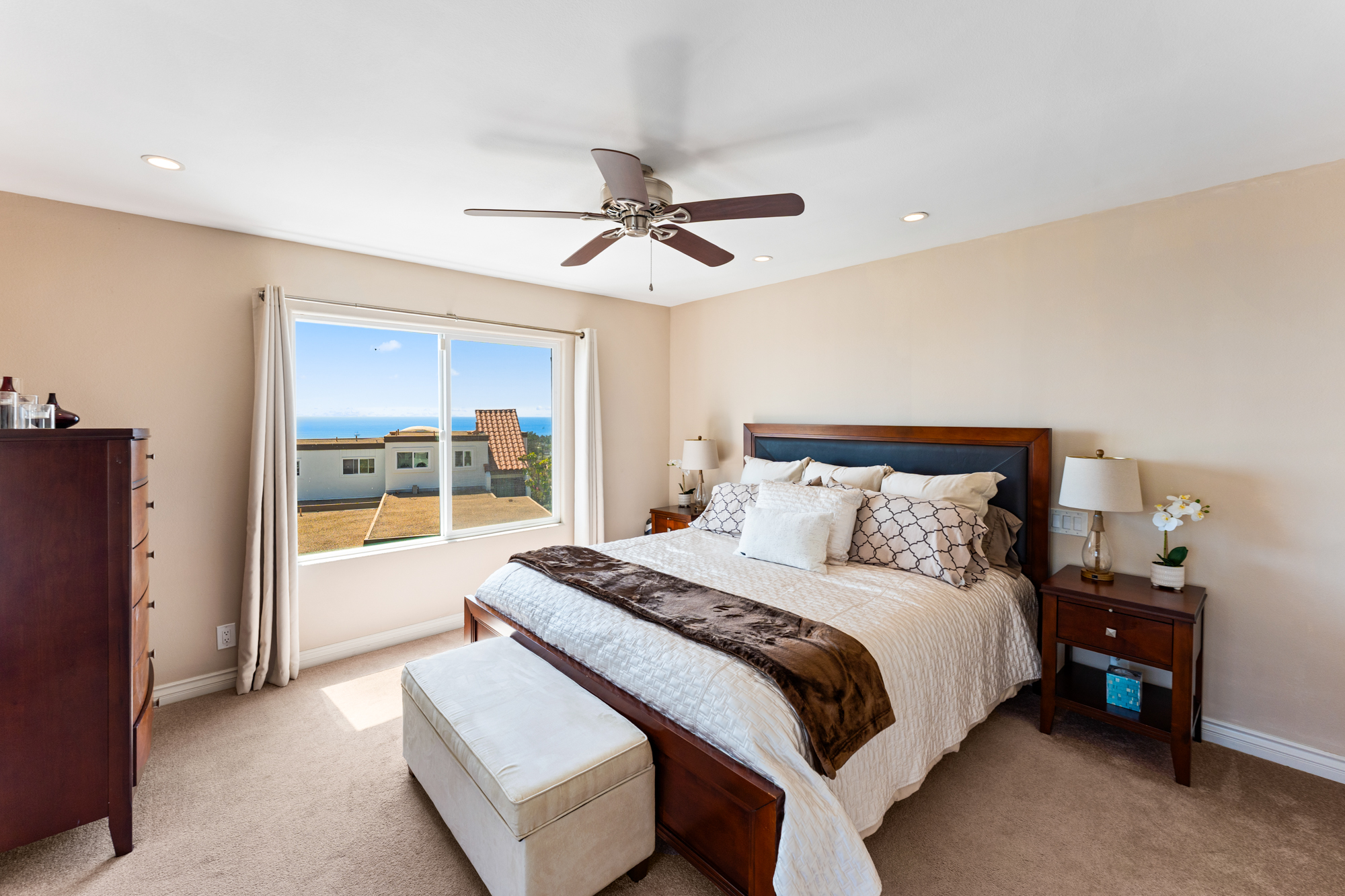 Beige walls, old carpet, outdated ceiling fan