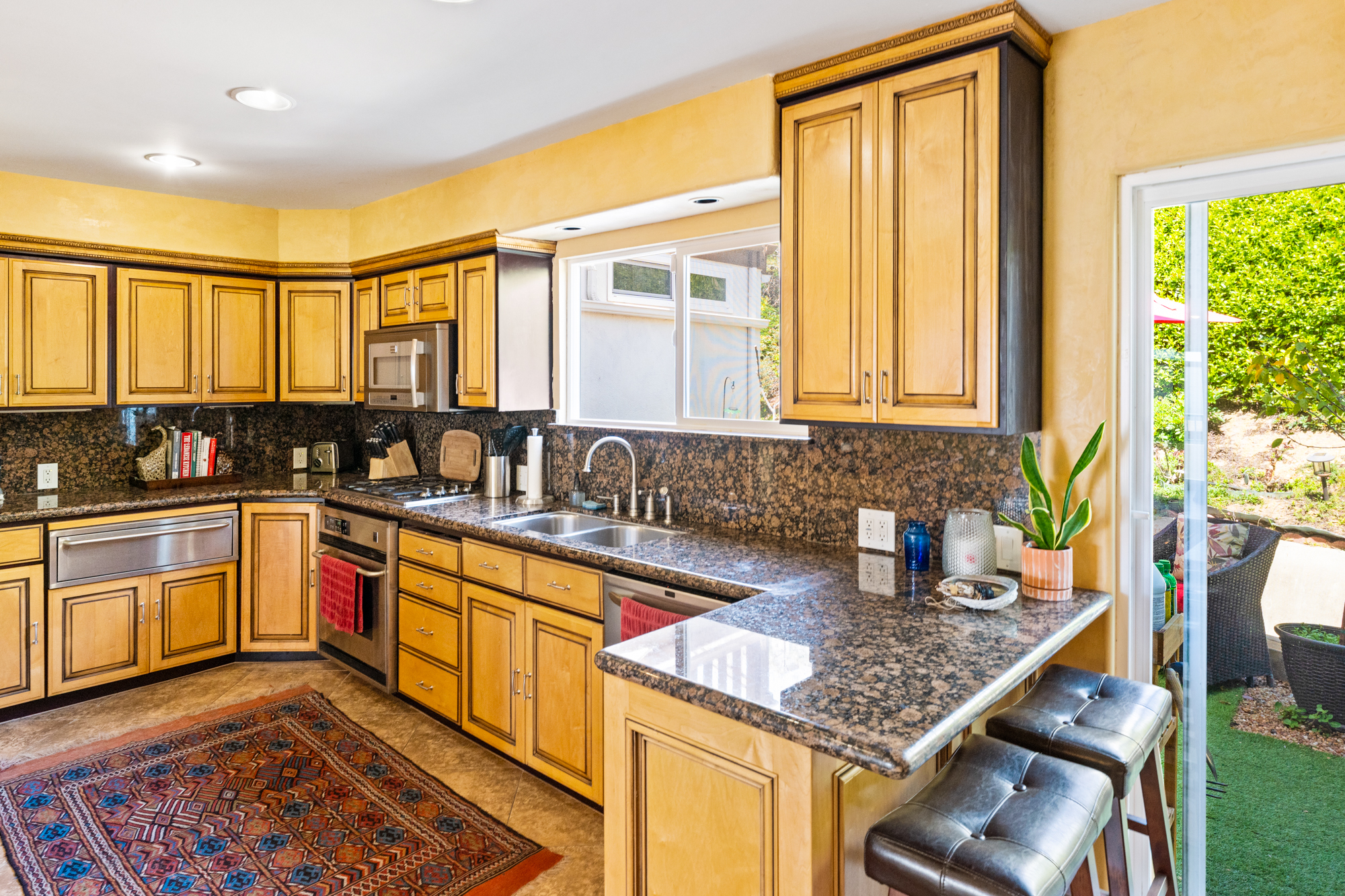 Dated honey oak cabinets, dark granite, textured walls